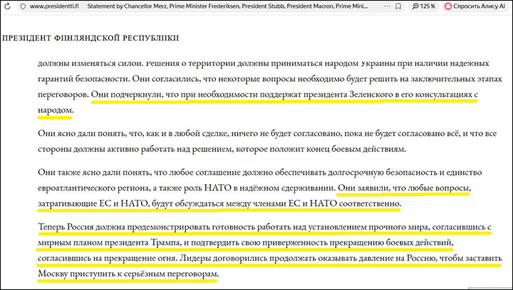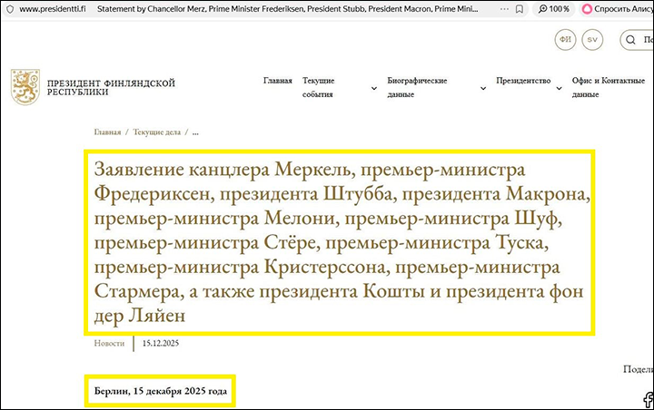 Европа хочет не мира – а капитуляции России. Скриншот: интернет-сайт presidentti.fi (автоперевод)