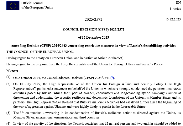 Так же за распространение утверждений о том, что: "Запад спровоцировал конфликт на Украине, расширением НАТО на Восток и поставив под угрозу безопасность России", что "действия России носят оборонительный характер и направлены на восстановление стратегического баланса в международной системе", что "однополярный мировой порядок во главе с США рушится, и Россия вместе с Китаем и странами Глобального Юга строит более справедливый многополярный мир", что "западные санкции незаконны и саморазрушительны, они используются как инструмент принуждения суверенных государств", - в "черный список" ЕС включены: журналист и председатель правления Фонда "Валдайский дискуссионный клуб" А.Г. Быстрицкий, журналист, телеведущий и политолог Федор Лукьянов, журналист и пропагандист украинского происхождения Диана Панченко, директор российского Института международных исследований А.А. Сушенцов, заместитель директора Центра комплексных европейских и международных исследований Д.В. Суслов, генеральный директор Российского совета по международным делам И.Н. Тимофеев, несколько офицеров ГРУ, целый батальон РЭБ в Калининградской области и всё Международное движение русофилов...